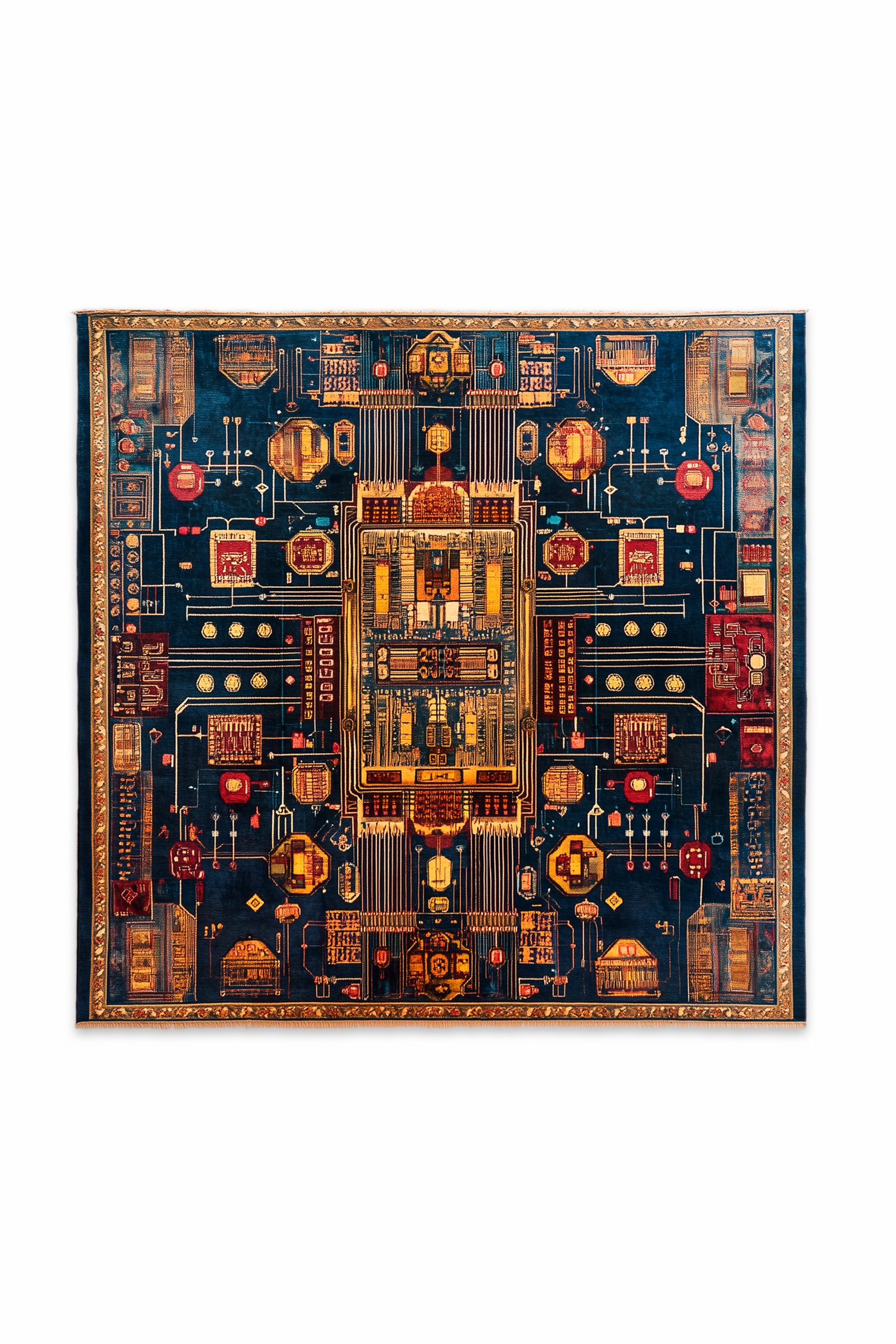 Cybercarpet è un progetto che indaga sostenibilità e ri-immaginazione della tecnologia attraverso l’uso di circuiti elettronici dismessi, trasformati in materia artistica. In una prima fase l’artista interviene su tappeti persiani antichi, inserendo i circuiti come segni attivi che mettono in dialogo memoria culturale e infrastruttura digitale. In una seconda fase il circuito diventa matrice generativa di nuovi tappeti tessuti a mano in Iran e Pakistan; il circuito originario viene reinserito nell’opera, chiudendo un ciclo tra idea, processo e materia. I titoli indicano le ore necessarie alla realizzazione, rendendo il tempo parte dell’identità dell’opera.