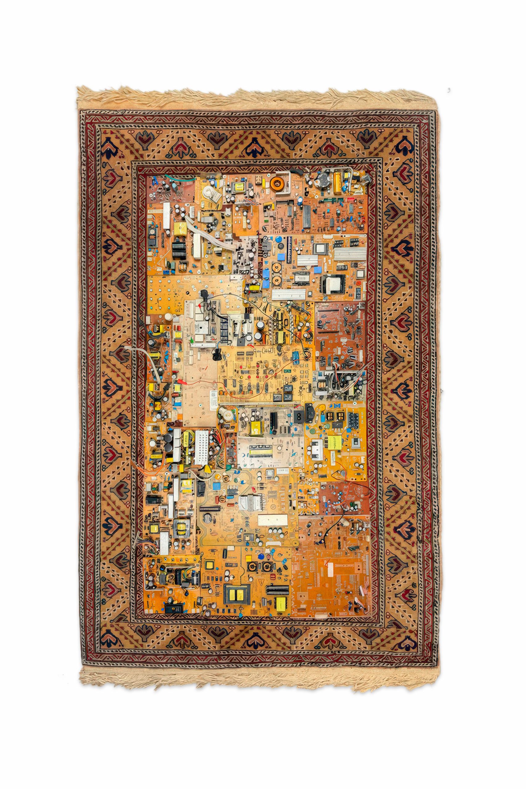 Cybercarpet è un progetto che indaga sostenibilità e ri-immaginazione della tecnologia attraverso l’uso di circuiti elettronici dismessi, trasformati in materia artistica. In una prima fase l’artista interviene su tappeti persiani antichi, inserendo i circuiti come segni attivi che mettono in dialogo memoria culturale e infrastruttura digitale. In una seconda fase il circuito diventa matrice generativa di nuovi tappeti tessuti a mano in Iran e Pakistan; il circuito originario viene reinserito nell’opera, chiudendo un ciclo tra idea, processo e materia. I titoli indicano le ore necessarie alla realizzazione, rendendo il tempo parte dell’identità dell’opera.