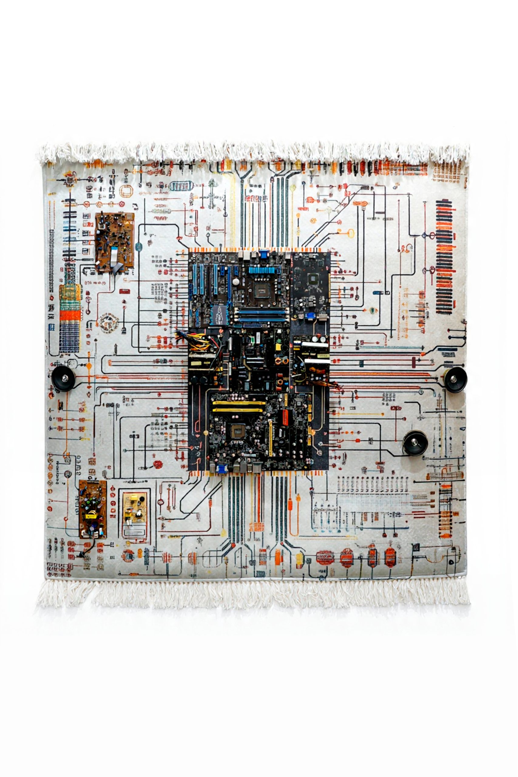 Cybercarpet è un progetto che indaga sostenibilità e ri-immaginazione della tecnologia attraverso l’uso di circuiti elettronici dismessi, trasformati in materia artistica. In una prima fase l’artista interviene su tappeti persiani antichi, inserendo i circuiti come segni attivi che mettono in dialogo memoria culturale e infrastruttura digitale. In una seconda fase il circuito diventa matrice generativa di nuovi tappeti tessuti a mano in Iran e Pakistan; il circuito originario viene reinserito nell’opera, chiudendo un ciclo tra idea, processo e materia. I titoli indicano le ore necessarie alla realizzazione, rendendo il tempo parte dell’identità dell’opera.